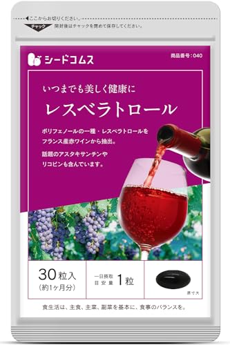 シードコムスのレスベラトロールサプリは、トランスレスベラトロール、赤ワインポリフェノール、アスタキサンチンを配合。約1ヶ月分(30粒)で、GMP認定工場にて国内製造されています。