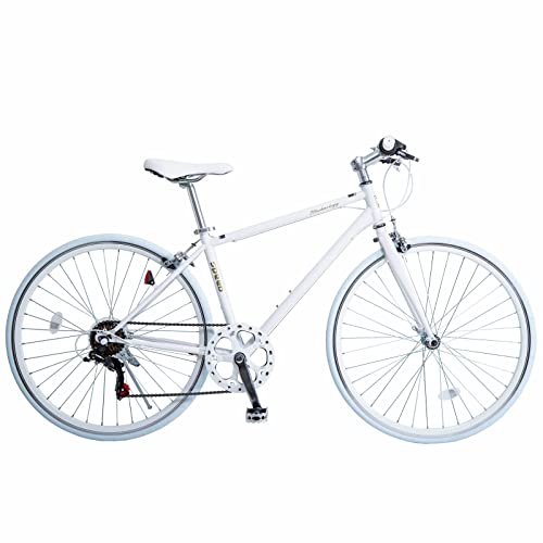 21Technology 自転車 クロスバイク CL266は、ホワイトカラーで700x28cタイヤを装備。シマノ製6段変速ギヤ、レボシフター、フラットハンドルバー、前後キャリパーブレーキが特徴の快適な仕様です。