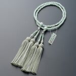 滝田商店の本式数珠は八宗兼用で、女性用にデザインされており、ビルマ翡翠を使用。8寸で正絹頭付房付き。京念珠としてすべての宗派で使用可能で、製作者証明書付きです。