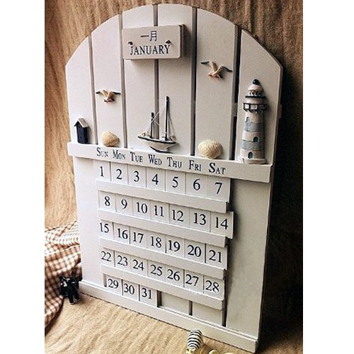 おしゃれな木製万年カレンダー。サイズは44cm×30cmで、壁掛けや立て掛けとして使用可能。アンティーク調で海の家のインテリアやエクステリアに最適。ギフトにもおすすめです。