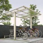 YKKAPのサイクルポート「エフルージュ ミニ ZERO FIRST 600タイプ」は、アルミ製でサビに強く、おしゃれなデザイン。ポリカ屋根標準高さで、家庭用自転車置き場に最適。アルミ形材色+木目色、ステン+ハニーチェリー仕上げ。