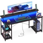 AODKゲーミングデスクは幅160cm、両側ラック&モニター台付き。コンセント&LEDライト付きで、左右入れ替え可能。勉強やゲームに最適な黒いPCデスクです。