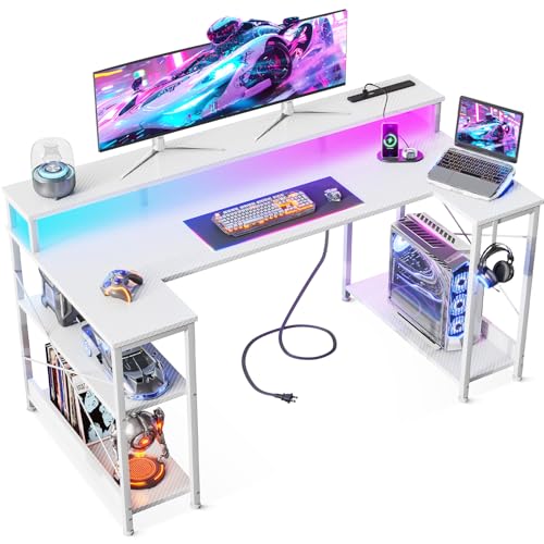 AODK ゲーミングデスクは幅120cmのU字型デザイン。両側にラックとコンセント付きで便利。LEDとモニター台も装備し、スタイリッシュなカーボン調ホワイト。左右入れ替え可能でおしゃれなPCデスクです。