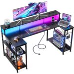 AODK ゲーミングデスクは、幅120cmのU字型デザインで、両側ラックとコンセント付き。LED&モニター台があり、左右入れ替え可能。カーボン調ブラックでおしゃれなPCデスク。