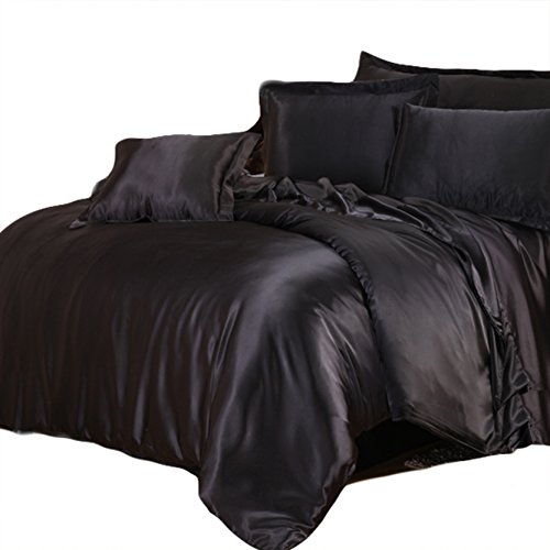 布団カバー4点セット(ダブル)は、無地のシルクと大豆タンパク繊維を使用。掛け布団カバー、ボックスシーツ、枕カバーのセット。カラーはブラックで、肌触りが良く、寝心地を向上させます。