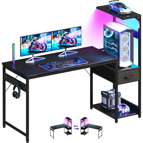 AODK ゲーミングデスクは幅137cmで、LED照明付き。引き出しと棚があり、フックも付属。カーボン調ブラックで左右入れ替え可能なデザインが魅力のPCデスクです。