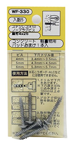和気産業のステンレスノープラグビスは、軽量物用のコンクリート用ビスで、5個入りのシルバー仕上げ。サイズは座付4×25mm(ラスパート)。耐久性が高く、強度にも優れています。