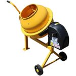アルミス 電動コンクリートミキサー まぜ太郎 AMZ-25Yは、混合練り上げ量上限約20L、ドラム容量約46Lで、幅500×高900×奥840mm、重量約23kg。ドラムは360度回転し、お客様組立式です。