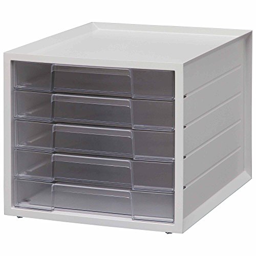 アイリスオーヤマの浅型5段レターケース。A4サイズ対応でインデックスシール付き。引き出し式で、書類や封筒の収納に最適。積み重ね可能なプラスチック製で、オフィスや在宅ワークに便利なアイテム。