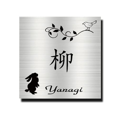 / ステンレス表札 =うさぎと小鳥= サンドブラスト・エッチング 正方形サイズ (15~20cmまで、1cm刻みでご希望サイズ作成できます) (15cm × 15cm)