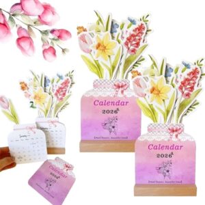 モチベーションカレンダー デスクカレンダー 2026 新ミニスタンド花柄デスクトップ(木製ベース付き) 同僚へのクールな贈り物(2pcs)