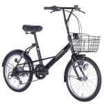 21Technologyの自転車、ミニベロSK206はマットブラックの20インチ小径車。シマノ6段変速ギヤを搭載し、前かご付きで通勤や買い物に最適なモデルです。