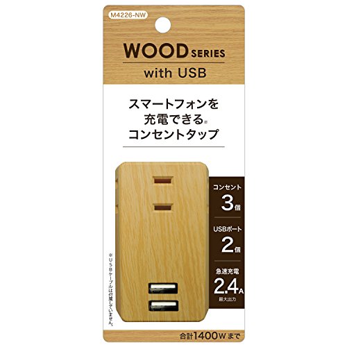 トップランド 3個口コンセントタップ・USB充電2ポート搭載。急速充電2.4A、合計1400W対応。ナチュラルウッドデザインでおしゃれなM4226-NW。
