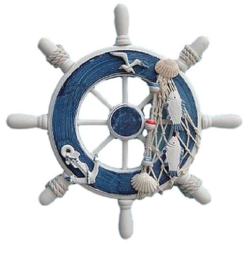 南欧風のマリンテイスト、船舵のデザインが特徴的なインテリア雑貨。おしゃれで、内装や外装にぴったりの装飾アイテム。マリンブルーの色合いが印象的です。