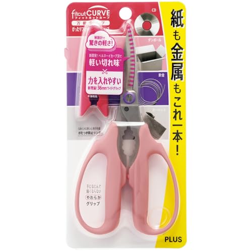 プラスのフィットカットカーブ万能はさみ(SC-175PM)は、軽量で紙や金属も楽に切れる便利なアイテム。ピンクのデザインで、使いやすさとスタイルを両立しています。