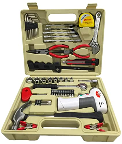山善(YAMAZEN)の電池式電動ドライバー付47点セットYKS-47P。電動ドライバー、プライヤー、ラジオペンチ、各種レンチ、ハンマーなど、多彩な工具が揃った充実のセットです。