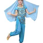 アラジン風ジャスミン衣装4点セットは、エレガントなデザインのトップス、パンツ、ベルト、ヘッドアクセサリーが含まれています。気品溢れる色合いで、コスプレやパーティーに最適です。