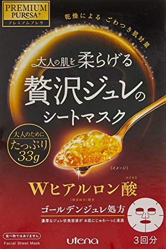 ウテナ PREMIUM PUReSA プレミアムプレサのシートマスクは、贅沢なジュレタイプでWヒアルロン酸配合。保湿効果が高く、肌にうるおいを与えます。3回分のフェイスパックが入っています。