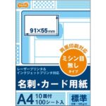 TANOSEEの名刺カード用紙は、A4サイズで10面、カードサイズ91×55mm。レーザー&インクジェットプリンタ対応。ミシン目が無く、きれいにカットできます。1冊に100シート。