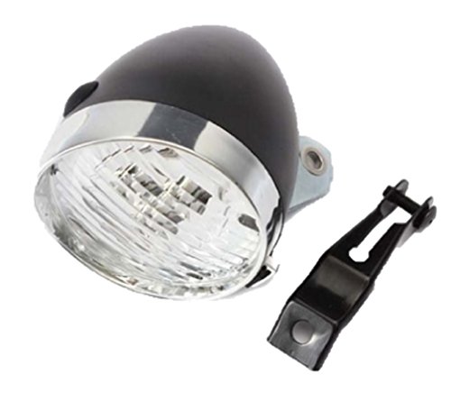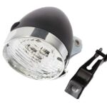 東川口商事の自転車用ヘッドライトは、3つのLEDを搭載した砲弾型のレトロクラシックデザイン。電池式で、取り付け金具が付属しており、簡単に取り付けられます。カラーはブラックです。