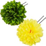 【かんざストア】手作りの髪飾り、Uピンタイプ。振袖、袴、浴衣、着物に最適な髪留め。キュートな花と蕾のデザイン、ファー付き。結婚式や卒業式、成人式にぴったりの2点セット(グリーン&イエロー)。プレゼントにもおすすめ。