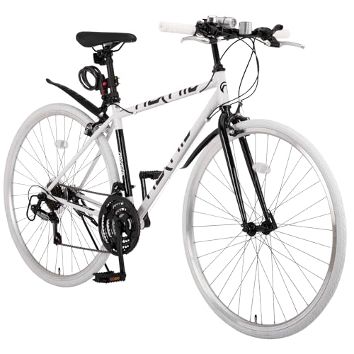ネクスタイルのクロスバイクNX-7021は700Cサイズ、シマノ製21段変速を搭載。適応身長155cm以上で、ホワイトカラーのデザイン。タイヤサイズは700x28Cです。