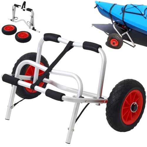 iimono117のカヤックカートは、ノーパンクタイヤ搭載の折りたたみ式で、ゴムボートやカヌーを楽に運搬できます。ビーチや湖での使用に最適なトローリーです。