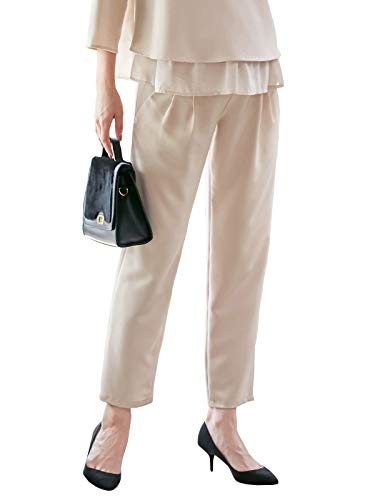 ANGELIEBEのマタニティパンツは、ストレッチジョーゼット素材で快適な着心地。テーパードシルエットで、ウエストはゴムとアジャスターで調整可能。妊婦服としてMサイズのベージュを展開。