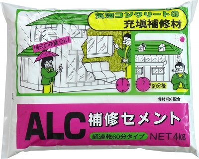 家庭化学のALC補修セメントは、充填補修材で超速乾60分タイプ。4kg入りで、サッシやドア廻りの目地、隙間の補修に最適です。使いやすく、短時間でしっかり固まります。