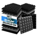 Arrowzoomの高密度吸音材(25×25×5cm)48枚セット。両面テープ付き、黒×グレー、難燃性。スタジオやオフィス、ホームシアターに最適な防音対策、エコー低減に効果的。