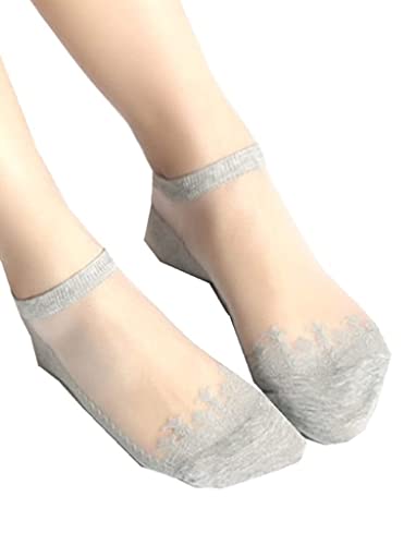 レディース用フットカバーで、シースルータイプのアンクルバンドソックス5足セット。脱げにくく、パンプスとの相性抜群。深履き設計で快適な着用感。カラーはクロで、レースデザインが魅力的。
