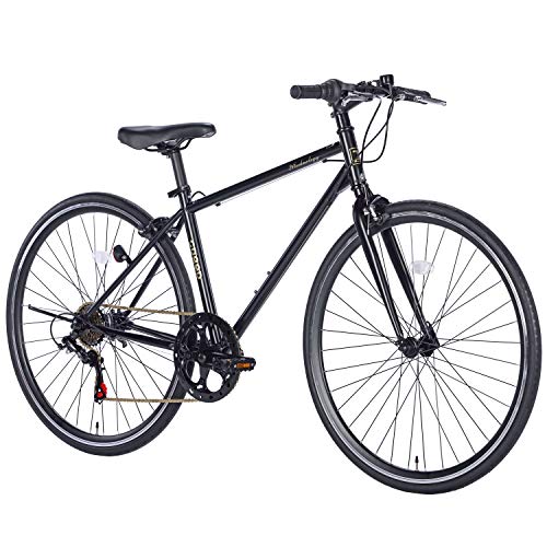 21Technology 自転車 クロスバイク CL266 マットブラック。700x28cタイヤ、シマノ製6段変速ギヤ、レボシフター、フラットハンドルバー、前後キャリパーブレーキ搭載。