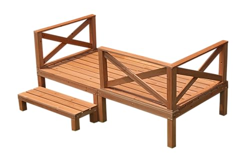 リビングアウトの天然木ウッドデッキは0.5坪の6点セット。デッキは幅90cm、奥行90cm、高さ36cm。ステップは幅86cm、奥行30cm、高さ28cm。コーナー・ストレートフェンスは幅86cm、高さ41.5cm、厚さ6cm。ウッドテラスは組立式です。