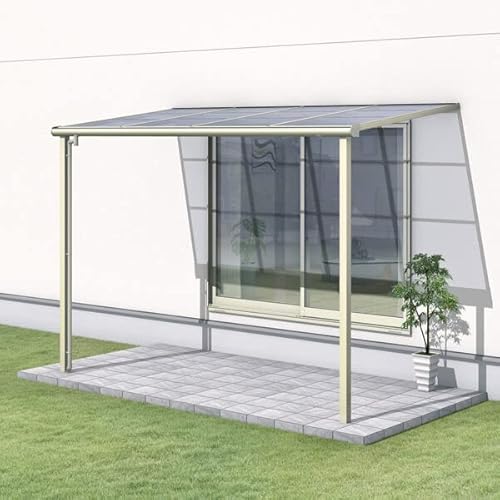 三協アルミ レボリューAは、2.5間×4尺の600タイプで、関東間の1階用F型です。標準収まりの2連棟で、ポリカーボネート製のブロンズ仕様。アルミ製でテラスやバルコニー、庭の雨よけに最適です。