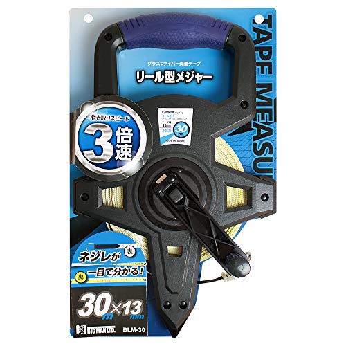 ビッグマンリール型メジャーBLM-30は、3倍速巻き戻し機能を搭載し、30mの長さを測定可能。耐久性に優れた素材で、持ち運びやすいデザイン。精確な測定が求められる作業に最適です。