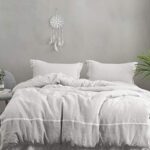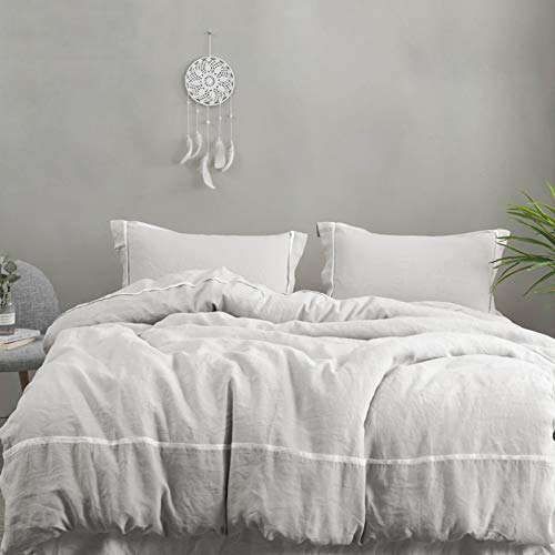 麻リネン100%のシングル寝具カバーセット。薄グレーの横縞デザインで、掛ふとんカバー、ボックスシーツ、枕カバーの3点セット。オールシーズン対応、抗菌防臭、吸湿通気性に優れ、触り心地が良く、北欧風のエレガントなデザインです。