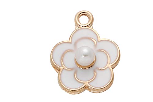 おしゃれなカメリア型のパール付きジュエリーチャーム、10個入り。サイズは1.8cm×1.4cmで、ゴールドの金属素材。ハンドメイドピアスやネックレス、レジン作品のデコレーションに最適な手芸材料です。