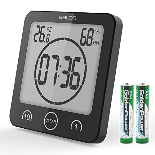 BaLDR防水時計は、お風呂やシャワーに最適なデジタルタイマーです。温度・湿度計機能付きで、置き掛けや貼り付けも可能。吸盤で設置が簡単、防滴・防塵仕様のブラックモデルです。