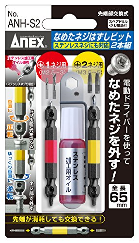 アネックス(ANEX)なめたネジはずしビットは、ステンレスビス対応のM2.5~5サイズ用です。2本組で、解体作業やネジの取り外しに最適なDIY工具です。