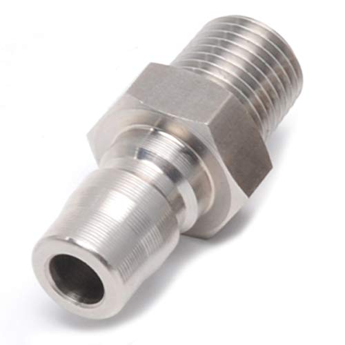 ステンレス製の1/4インチワンタッチカプラプラグ(オス)は、Rc1/4(メスネジ)に適合。耐腐食性に優れ、長寿命を実現。簡単な接続と切断が可能で、各種配管や機器に最適です。