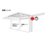 四国化成のサイクルポートV-Rオープンタイプは照明付きのY合掌タイプ連棟ユニットで、積雪20cmまで対応。屋根材はポリカ板(片面クリアマット)で、ブラックつや消し仕上げ。施工には基本セットの別途購入が必要です。