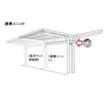 四国化成サイクルポートV-Rオープンタイプは、照明付きでY合掌タイプの連棟ユニット設計。積雪20cmに対応し、屋根材はアルミ押出形材LVCL-4030、ステンカラー仕上げ。基本セットの別途購入が必要です。