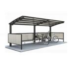 四国化成のサイクルポートV-Rクローズタイプは、連棟用基本セット(2連棟セット)で、積雪20cm対応の標準高です。屋根材はアルミ樹脂複合板を使用し、仕上げはスタイリッシュなステンカラーです。