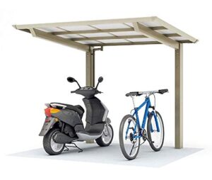 四国化成のV-RオープンタイプY合掌連棟基本セット(2連棟)は、積雪20cm対応。屋根材はポリカ板使用、カラーはステンカラーとグレースモーク。耐久性に優れたサイクルポートです。