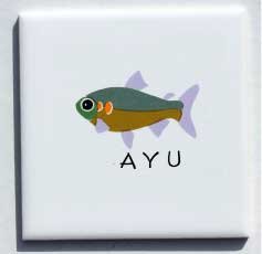 100角壁用アクセント絵タイル「アユ」は、鮮やかなデザインが特徴の美しいタイルです。水の流れをイメージしたアートが施され、空間を引き立てます。耐久性も高く、インテリアに最適です。