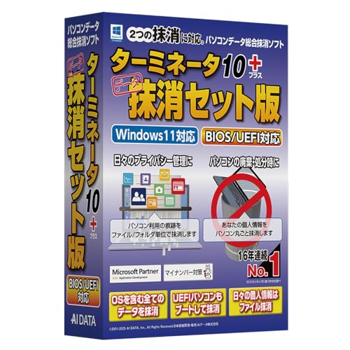 AOSデータ ターミネータ10 plus 抹消セット版は、BIOS/UEFIに対応したデータ消去ソフトウェアです。高いセキュリティ基準を満たし、HDD/SSDのデータを完全に消去します。簡単操作で安心のデータ管理を提供します。