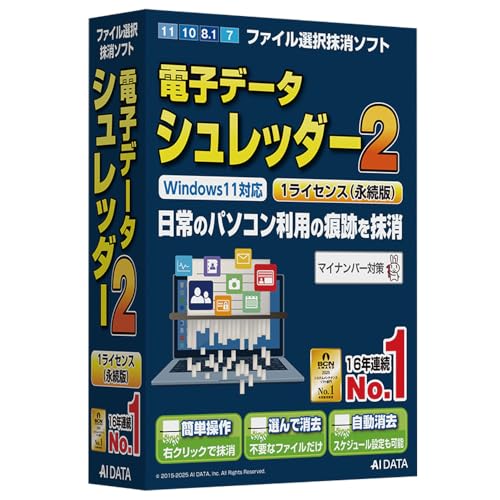 AOSデータ 電子データシュレッダー 2は、ファイル単位で個人情報や機密データを復元不可能に消去する情報漏洩防止ソフトです。1ライセンス版の永続版です。