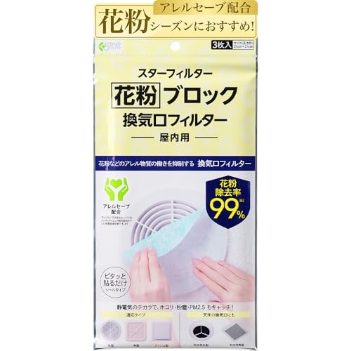 花粉ブロック換気口フィルターは、アレル物質を抑制する屋内用製品です。貼るだけで簡単に取り扱え、サイズは21x21cm、3枚入り。黄砂やPM2.5にも対応。通気性を維持し、快適な空間を保ちます。
