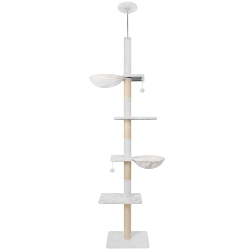 ROYPETキャットタワーは高さ229~267CMで、突っ張り式の省スペース設計。麻縄巻きの爪とぎとハンモック、おもちゃが付いており、猫の遊び場所や休息に最適です。