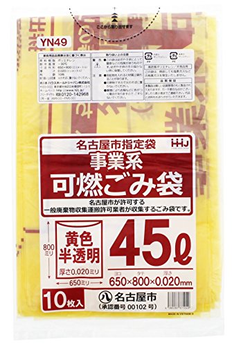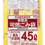 ハウスホールドジャパンのゴミ袋(ダストボックス用)は、名古屋市指定の事業系可燃ゴミ用で、容量は45L。半透明の黄色デザイン、10枚入り。軽量で扱いやすく、ゴミの分別に最適です。